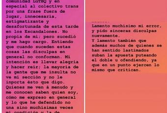 Luego, se volcó a su cuenta de Instagram para explayarse. ” Mis disculpas públicas a la comunidad LGBTQ y en especial al colectivo trans por una frase fuera de lugar, innecesaria, estigmatizante y desafortunada de esta tarde. No propia de mí, pero sucedió y me hago cargo”.
