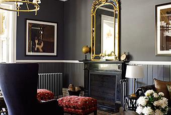 Azules, rojos y unas pinceladas de violeta y verde musgo, en sus tonalidades más oscuras. Es la paleta de colores utilizada en esta vivienda de estilo victoriano cuya decoración sin duda está inspirada en el deporte de la hípica. Así, podemos ver fustas y botas de montar sobre el fondo rojo de la tapicería de las banquetas, y "jockeys" sobre el fondo verde de los cojines de los sofás "chester" del salón. Los cuadros y fotografías de caballos decoran todas las estancias, pero sobre llama la atención la colección de seis litografías antiguas, obra del retratista y caricaturista británico Leslie Ward "Spy". Una colección de la que me atrevería a decir ha sido la gran inspiradora de esta elegante combinación de colores... Puedes ver AQUÍ más paletas de color para inspirarte