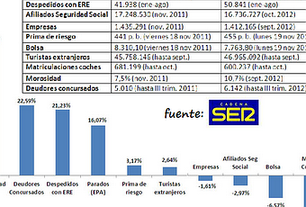 http://www.cadenaser.com/economia/articulo/ano-cifras/Una vez leído, lo con indisimulada sorna entregado, y envuelto en un profundo silencio, he retornado al interior de mi casa. Cabizbajo he cerrado el balcón, corrido los cortinones y escudado en una sobria penumbra, me he acordado, con saña inusual en mí, de todos los parientes, tanto vivos como finados, de los politicuchos tan "serios y profesionales" mayoritariamente votados aquel 20N.