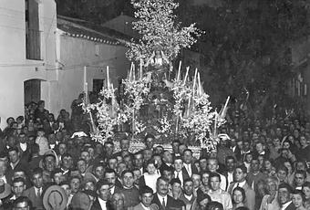 El paso se encuentra en la calle Veredas, rodeado de una multitud como siempre, destaca como la gente está pendiente de la cámara de Sánchez del Pando quien realizó la fotografía el 8 de septiembre de 1927. Ese año participó en las fiestas el conocidísimo capuchino fray Juan Bautista de Árdales, considerado el máximo erudito de la devoción pastoreña en el siglo XX, este dejó escrito: “… el típico Rosario de la víspera es algo inenarrable; en la Función de la fiesta de la Pastora ha de predicar uno de los mejores oradores de España y la procesión de la noche con la Imagen entre arcos de flores y luces y el clamoreo del fervor del pueblo, es algo tan emotivo y fantástico que se recuerda como un sueño o visión.”