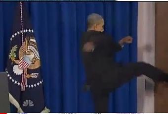 El presidente de Estados Unidos se enfada (¿por WikiLeaks?) y pega una patada en una puerta al terminar una sosegada rueda de prensa.Los especialistas en trivializar y ofrecer diversión, lo hacen una vez más.