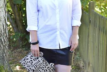 Yo quise ponerla de la manera más sencilla posible, con esta mini de cuero y sandalias gladiadoras altas. Mi nuevo clutch de estampado leopardo y unos pendientes largos en color coral que aportan luz y calidez al look.