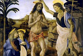 (Óleo El bautismo de Cristo, 1475, de Andrea Verrocchio y Leonardo Da Vinci, Galería de los Uffizi, Florencia; Hornacina con el grupo escultórico Cristo y santo Tomás, iglesia de San Miguel, Florencia, copia del original ubicado en la tercera planta de la iglesia de San Miguel, Florencia, 1488, Andrea Verrocchio; Fachada exterior de la iglesia de San Miguel, Florencia, donde se aprecia a la izquierda la hornacina con la copia de la escultura de Verrocchio, Florencia; Detalle del grupo escultórico de la hornacina, Florencia; Detalle de la escultura en bronce de Verrocchio, La duda de Santo Tomás -Cristo y Tomás-, 1488, Museo de la iglesia de San Miguel, Florencia.)