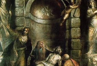 Acentúa la tensión de la escena el juego entre el torrente de luz y la penumbra que se entrecruzan en este cuadro de atmósfera espectral. Dos diagonales, con un Jesucristo blanquecino y brillante en el vértice inferior, señalando la prevalencia de la luz de la verdad, componen el cuadro; a los lados Moisés, con las tablas de la ley, y Helesponto, portando la cruz y la corona de espinas. María en su regazo acoge al Hijo de Dios, y a cada uno de sus lados María Magdalena y Nicodemo. El ángel con la antorcha, como símbolo de la vida eterna, y los leones, representación de Venecia. Ambiente brumoso, como el propio ambiente de Venecia.