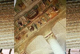 Frescos románicos de la iglesia de Saint-SavinLa iglesia de Saint-Savin alberga el conjunto más destacado de pinturas murales románicas (siglo XI) conservadas en Francia.La pintura al fresco evolucionó durante el periodo carolingio. Entre los ejemplos conservados más antiguos de pintura mural prerrománica alemana destacan los de la iglesia abacial de San Jorge en Oberzel, en Reichneau; los de la capilla de San Silvestre en Goldbach, en la orilla alemana del lago Constanza; los de San Andrés, cerca de la antigua ciudad de Fulda, al noreste de Frankfurt. Sin embargo, el estilo de las pinturas murales que no se han conservado puede deducirse por los manuscritos miniados de la época. Estas obras continuaron en gran medida las tradiciones del arte paleocristiano y bizantino, pero incorporaron decoraciones muy complicadas, con motivos entrelazados de origen irlandés y zoomorfos germanos. Los ejemplos de pintura mural conservados incluyen motivos abstractos en los elementos arquitectónicos aislados, tales como columnas, y representaciones de escenas bíblicas y de las vidas de los santos en las grandes superficies murales. En estas composiciones, influidas por las pinturas y mosaicos orientales, las figuras son estilizadas y delicadas, ya que se concibieron como símbolos más que como representaciones naturalistas. De la extensa decoración mural realizada en otras zonas de la Europa occidental sólo se conservan algunos ejemplos, entre los que destacan los frescos, fechados en los siglos XI y XII, de las iglesias de San Juan de Poitiers y de Saint-Savin-sur-Gartempe, en la antigua provincia de Poitiers.En el ámbito de la península Ibérica la pintura románica está muy bien representada en las áreas catalano-aragonesa y castellana. Se conservan importantes restos pictóricos murales de muchos templos. En algunos casos todavía se pueden observar in situ las decoraciones murales de la edad media, pero la mayoría de las pinturas han sido trasladadas a lienzos y se conservan en diferentes museos del país.Deben distinguirse por una parte las representaciones murales pintadas al temple que cubrieron el interior de las iglesias, realizada sobre la superficie de los ábsides, la nave central y laterales o incluso el muro occidental, y por otra las pinturas sobre tabla de los antependios, piezas de madera rectangular que, con temas como el pantocrátor y el tetramorfo, la Virgen o las vidas de los santos, cubrieron los frentes de los altares principales.Dentro de la pintura mural se distinguen dos corrientes pictóricas. Por una parte, la corriente ítalo-bizantina desarrollada en el área catalana que recoge las fórmulas orientales, y por otra la corriente francesa, que continúa las formas del arte carolingio u otónico, centrada fundamentalmente en el área castellana.