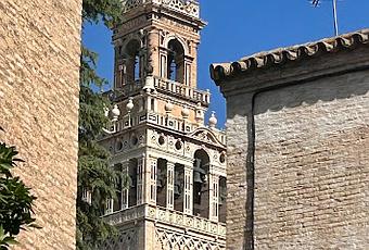 Por encima del lienzo de muro en el que se encuentra el retablo cerámico del Cristo de las Misericordias se puede vislumbrar el último tercio de la torre de la Giralda.