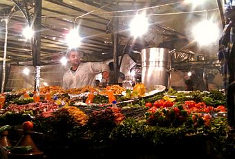 Pero es al caer la noche, cuando esta peculiar “rave” alcanza su punto álgido. Decenas de puestos de comida ambulantes se instalan en el centro de la plaza. Es en ese momento, con los últimos estertores de claridad, cuando debemos subirnos a una terraza cercana y contemplar la Plaza desde las alturas, siempre custodiada bajo el minarete de la mezquita de la Koutoubia, e iluminada por decenas de faroles de queroseno, y observar como una inquietante neblina asciende del epicentro de la plaza. Te da la sensación de que la tierra se ha abierto, dejando abiertas las puertas del infierno. Y es que decenas de parrillas y calderos se han encendido para ofrecer brochetas, merguez (salchichas especiadas) acompañadas con harira (una deliciosa sopa de lentejas) y otra serie de delicatessen marroquíes. Bien es cierto que la higiene no es el punto fuerte de estos puestos callejeros, pero el ambiente que se respira en ellos bien merece la pena una cena.