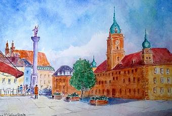 Acuarela sobre papel Gvarro 43X3, pigmentos y pinceles Rembrandt.La Plaza del Castillo de Varsovia (en polaco, plac Zamkowy w Warszawie) es una plaza histórica situada frente al Castillo Real, antigua residencia oficial de los reyes de Polonia.