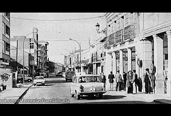 Imagen de la calle de la Plaza de Fuenlabrada en 1977, a la altura de la Plaza de España. A la derecha vemos los soportales del Ayuntamiento y sus casas colindantes. Podemos apreciar la calle con farolas por aquel entonces modernas, y con ausencia de grandes aceras.