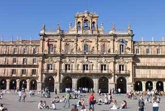 最初の観光地は「マジョール広場 la Plaza Mayor」。サラマンカのマジョール広場は世界で最も美しい建築物の一つであると言われています。ビジャマヨール(サラマンカ郊外の町)原産の黄金色の石を使った完璧すぎるその姿は一見正方形に見えるほど。