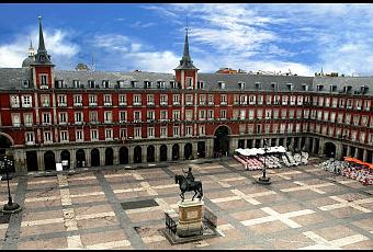 La plaza del Arrabalconocida con este nombre por su situación extramuros, no se encontraba lejos del Alcázar y posibilitaba el crecimiento de Madrid, la corona acabó comprando los terrenos.A finales del siglo XVI Herrera traza un primer proyecto, pero no es hasta 1617 cuando se comienzan las obras que responden al trazado de Juan Gómez de Mora, arquitecto también del Monasterio de la Encarnación.La Plaza Mayor se concibe desde el primer momento como un gran espacio rectangular de grandes proporciones, con soportales porticados, en los que se abrían y se abren los distintos comercios y varias plantas de edificios sobre ellos.Diferentes incendios fueron variando el primitivo propósito, como el que en 1672 afectó a la Casa de la Panadería (levantada en 1590 por Diego Sillero, en ella ejercían sus actividades los panaderos) es entonces cuando interviene Juan de Villanueva, al que se le debe el aspecto actual de la plaza.Juan de Villanueva y sus discípulos dieron a la plaza una nueva estética en consonancia con el estilo Neoclásico. Suprimieron las dos plantas superiores y unificaron las restantes mediante cornisa y cubierta a dos aguas y abuhardillada, sustituyendo la madera primitiva por la pizarra y por la piedra. En su centro se levanta la estatua de Felipe III.Los arcos de medio punto trazados por Villanueva cierran por completo la plaza al tráfico rodado y eliminaron las perspectivas que quedan reducidas a callejones, a través de estos el de Felipe III o el del 7 de Julio, el espectador cambia por completo de escenario desembocando en el ambiente ruidoso y abigarrado que conforman las calles de su entorno, cada una de las cuales es un mundo diferente que conducen a su vez a lugares y espacios sorprendentes del viejo Madrid.La Plaza Mayor es un lugar de paseo y de encuentro donde podemos encontrar los más variopintos personajes, desde mimos que compiten entre sí por exhibir el más original de los atuendos , hasta pintores que llenan los soportales con sus obras , pasando por talentosos músicos que inundan el aire con música clásica. En el pasado se celebraron en su recinto representaciones teatrales, autos sacramentales, corridas de toros, ajusticiamientos y ferias.En sus soportales encontramos cafeterías y antiguas tabernas que sacan sus terrazas a la plaza, en cada uno de los callejones encontramos lugares donde poder tomarnos una caña con pincho, un café con leche en español , como el recomendado en Buenos Aires por la alcaldesa Ana Botella o deliciosos bocadillos de calamares. Buen provecho.