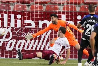 Pese a que los nuestros mantenían el partido bajo control, el Albacete Balompié también mostró su peligro en ataque. De hecho, Caro tuvo que intervenir para despejar tras un remate de cabeza de los locales y el balón acabó estrellándose en el palo.