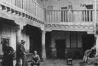 Arrieros y pastores forman corrillo en su puerta; en el patio corretean las gallinas, picoteando entre los guijarros del pavimento; de los postes de madera blanqueada, columnata que sostiene la galería del piso superior, penden los arneses de las recuas, y en el fondo se ve una monumental y antiquísima caja con remiendos de madera nueva; el famoso arcón de la cebada, que es como mostrador u oficina de toda posada española, pues sobre su mugrienta tapa se verifican pagos y cobros y el posadero inscribe en viejo libro todas sus cuentas.