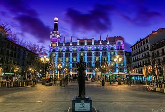 La Plaza de Santa Ana, alma y corazón del barrio que la bordea puede resultar estéril cuando la atraviesas de día, sin embargo, iluminada y envuelta en la complicidad que le regala la noche, es totalmente imposible no quedarse prendado de ella y gran parte de esta culpa recae en el Hotel ME Madrid Reina Victoria, cuyos reflejos morados sobre la impoluta fachada blanca la convierten en una de las miradas más seductoras de todo Madrid. Además, en contadas ocasiones, el cielo de la ciudad decide ir vestido con el mismo tono, lo que provoca, como apreciamos en la foto, un espectáculo casi divino.