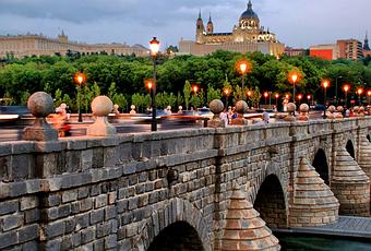Sobre una franja verde, se destapan el Palacio Real y la Catedral de la Almudena, coronando una visión sutil y cálida. Buena culpa del calor que desprende esta mirada es de esas farolas encendidas que, a primera hora del día o a la última, según se mire, se enredan en un tórrido romance con los cielos de Madrid. El resultado habla por sí mismo. Llamado originalmente Puente Segoviana, su visión desprende historia, la vida se disfraza vertiginosa sobre su tablero mientras que para él no avanza el tiempo. Y que no pase nunca.