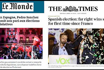 El resultado de las elecciones generales, en las que los socialistas ganaron, son mostrados por la prensa internacional sin dejar de advertir del debut de la prensa ultraderecha en España, uno de los pocos reductos que quedaba en Europa. El norteamericano New York Times explica que “Los socialistas fortalecen el poder en las elecciones de España”, pero recuerda que “el presidente Pedro Sánchez necesitará formar una coalición para gobernar”. Al explicar la irrupción de Vox, expone: “Un partido antiinmigrante y ultranacionalista gana sus primeros escaños en el Parlamento, un cambio importante en un país que durante mucho tiempo pareció ser inmune a la propagación de los movimientos de extrema derecha en toda Europa, en parte debido al legado de la dictadura de Francisco Franco”. El Washington Post titula: “El Partido Socialista de España gana fácil las elecciones mientras la extrema derecha se prepara para ingresar en el parlamento”, recordando los dos grandes temas que protagonizaron la jornada. Y la revista Time recuerda: “Los socialistas ganan en España, pero el partido Vox gana popularidad”. Explica que un partido de extrema derecha logró un aumento sin precedentes de apoyos para ingresar a la cámara baja del Parlamento por primera vez en cuatro décadas”, acordándose de Fuerza Nueva de Blas Piñar.