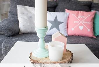 Para acompañar la mesa recurrí de nuevo a la rodaja de madera, el candelabro pintado de chalk paint que os enseñé aquí, una vela (que haríamos sin ellas) y una casita de madera en rosa coral, se puede decir que son mis nuevos básicos en casa.