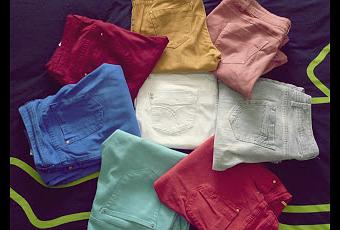 Foticos de mi pequeña colección de vaqueros “coloreados”: Mostaza, nude, gris claro, rojos, verde pastel, azul, granate y como no, blanco.