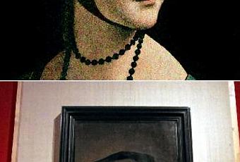 La suerte de la pintura previa al muy convulso siglo XX comenzó en realidad en Milán. Leonardo la creó por encargo del duque Ludovico El Moro. La dama es Cecilia Gallerani, tan bella como joven amante del duque, retratada con 17 años, cuando Leonardo contaba poco más de 40. Las sucesivas restauraciones no han tocado la figura de la mujer, pero sí han afectado a su fondo. Se sabe que el negro actual no es el original. Tampoco, la firma que aparece en la parte superior izquierda.
