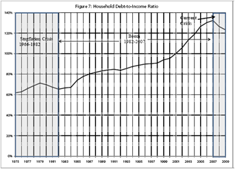 En la figura N° 4 del artículo, se observa un descenso sostenido de la tasa de interés. En 1981 alcanzó el 14% y para el 2007 apenas un poco más de 4%. Esta caída estrepitosa de la tasa de interés trajo consigo un mayor consumo familiar y un mayor endeudamiento. Se les ofreció a las familias un endeudamiento barato para así sopesar el lento crecimiento de los salarios reales. Asimismo, esta mayor oferta de crédito fue posible en la medida de una mayor flexibilización del sistema financiero estadounidense.Así, ambos factores, el menor crecimiento relativo de la remuneración salarial y la caída de la tasa de interés elevaron la tasa de ganancia empresarial, lo cual incrementaría la acumulación de capital y así el boom del crecimiento entre 1982 y el 2007.Pero, este boom trajo consigo un mayor endeudamiento de las familias; a tal punto que el ratio deuda – ingreso disponible aumentó aproximadamente para el mismo periodo en 75%. El endeudamiento había sido llevado a límites insostenibles, ya que durante la década de los noventa el ratio servicio – ingreso familiar se elevó de 10,8% (1994 – 1S) a 14% (2008 – 1S), para luego descender durante la crisis. El profesor Shaikh muestra la primera evidencia en la figura Nº 7.