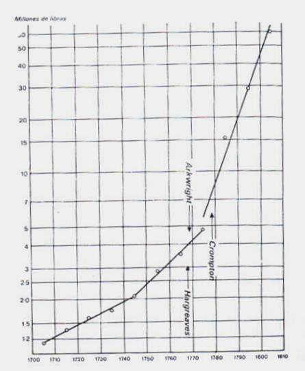 Crompton ideó una máquina de hilar que combinaba y superaba a las dos anteriores, la mule jenny (1779). Producía un hilo fino, pero muy resistente. Entre 1825 y 1830, Roberts diseñó una mule totalmente automáticaTodos estos avances propiciaron un fuerte crecimiento de la producción de la industria algodonera inglesa como se refleja en el siguiente gráfico: