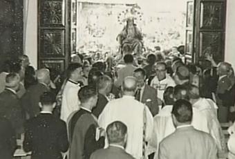 La histórica fotografía recoge el instante en que la Divina Pastora entra en su Santuario por primera vez sobre los hombros de sus hijos.