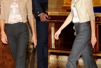 Dña. Letizia concedió varias audiencias esta mañana en el Palacio de la Zarzuela. La Princesa eligió un conjunto de blusa de raso beis y pantalón gris, que combinó con zapatos planos de atar de ante gris y chaqueta a juego con lentejuelas bordadas y manga al codo. Los zapatos le otorgaron al conjunto un aire mucho menos formal y dieron al conjunto un look casual-chic.