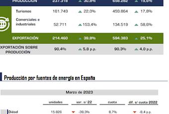 La producción de vehículos alcanza las 658.282 unidades en el primer trimestre de 2023 en España , un 19,6% más, en marzo se han exportado un total de 214.460 unidades se han producido 27.799 vehículos electrificados, el 11,7% de la producción nacional