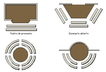 A través de la historia, la mayoría de los teatros han empleado tres tipos de escenario: de proscenio, de corbata y circular o arena. El escenario de proscenio es una plataforma elevada que se sitúa frente al público. Queda normalmente en uno de los extremos de un espacio rectangular. La versión más simple de este tipo de escenario es el de cajón o caballete, un escenario elevado con un cortinaje como fondo y cubierto, en ocasiones, por un toldo. Éste era el tipo de escenario que utilizaban los mimos griegos y romanos, los saltimbanquis y juglares medievales, la Commedia dell’arte y los actores populares, en general, hasta el siglo XX. Véase también Teatros del mundo; Dirección escénica.5.2 Auditorio