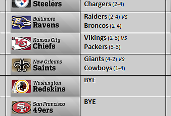 Parece que algunos problemas en blogspot impiden mostrar la imagen correctamente, así es que paso a detallar mi quiniela para la semana 7, como ganadores: Falcons, Steelers, Ravens, Chiefs, Saints, Redskins, 49ers, Rams, Eagles, Cardinals, Patriots, Broncos, Vikings & Cowboys. Aciertos hasta esta jornada: 53.