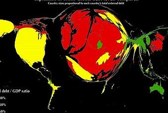 Este es un mapa de la deuda pública en relación al PIB de los países, según datos del FMI, la OCDE y la CIA World Factbook publicados en Wikipedia. Fue realizado por Ben David Hennig, del Departamento de Geografía de la Universidad de Sheffield y publicado en el sitio Worldmapping. El tamaño de los países en el mapa es proporcional al tamaño de su deuda/color. Verde para aquellos países con deudas inferiores al 30% del PIB; amarillo entre 30% y 60% y rojo para aquellos con deudas superiores al 60% del PIB.