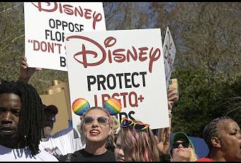 Un grupo de activistas LGBT se manifiesta en Disney en Orlando, Florida, el 3 de marzo. El Senado de Florida ha aprobado una normativa que restringe que los profesores hablen con sus alumnos sobre orientación sexual e identidad de género y permite que los padres puedan demandar a los centros si se saltan esta regla. La comunidad LGTB busca el apoyo de Disney, que es clave para la economía de este estado como sede de sus parques de atracciones. La presión para la empresa ya está en forma de parones de 15 minutos entre los empleados que trabajan en los parques de atracciones de Florida y California –este martes hubo una huelga general–, con la movilización en redes sociales con las etiquetas #DisneyDoBetter (“Disney, hazlo mejor”) o #DisneySayGay (“Disney, di gay”), entre otras. Disney podría ser clave en este caso por el poder económico que tiene en el estado, ya que da trabajo a más de 77.000 personas en Florida y sus extensos parques temáticos de Walt Disney World juegan un papel importante en la salud económica del turismo.