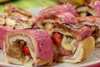 3. Bañamos con sirope de chocolate, enrollamos y llevamos al congelador por media hora. Cortamos, servimos y listo