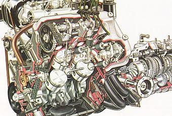 En este caso la ilustración de Rosso nos muestra el motor del Fulvia 1300 inclinado sobre su lado izquierdo, y con dos árboles de levas a la cabeza. Además, se ve la caja puente, ya que tenía tracción delantera. La transparencia la tomé de la página 138 del tomo 7 de la Enciclopedia Salvat del Automóvil.