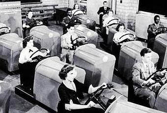 La imagen de hoy recoge los alumnos de una autoescuela neoyorquina allá por los años cincuenta, al frente de unos simuladores que uno no tuvo ocasión de conocer en este nuestro país. Viene a cuento de la intención, por parte de la Directora General de Tráfico, de imponer una reválida a los conductores con más de veinte años de carnet, en base a que las estadísticas aputan un remonte de la siniestralidad con víctimas por encima de los cuarenta y cuatro años de edad.