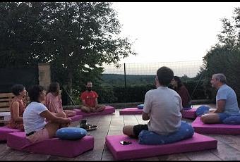 A apenas dos minutos andando, nos abrió una improvisada puerta a un precioso huerto con vistas al campanario del pueblo, que también les había cedido alguien del pueblo como muestra de afinidad con los principios que les inspiran. Gracias a nuestros pinitos hortelanos del último año, pudimos apreciar que lo que allí estaban haciendo gente como Joserra, Miki o Irene de forma casi espontánea, era una auténtica obra de arte de la horticultura: formas de mandala en la disposición de las distintas especies; flores, frutos y hojas en perfecta armonía con lo que normalmente se suelen considerar "malas hierbas"; mini espacios para favorecer que algunos pequeños animalillos puedan convivir con las distintas variedades de frutas y verduras... Joserra aprovechó para recolectar un calabacín y un par de lechugas para la improvisada cena que nos aguardaba en casa.En una curiosa sincronicidad, justo llegando a la entrada de la casa, apareció un coche con Pablo, Lucía, Roxana y Daniela, que venían a compartir velada ante la espontánea invitación de Joserra con motivo de nuestra visita. Nos pareció hermoso que, tras las presentaciones y risas iniciales, se abriese un círculo de meditación y de compartir en el jardín, como forma de abrir ese improvisado encuentro de amigos. Mientras meditábamos en silencio, y los chicos disfrutaban en la piscina, Miki e Irene se unieron al círculo, bajo la atenta mirada de un sol con forma de bola de fuego. El compartir tras la meditación, permitió romper el hielo, y así irnos conociendo un poco mejor. Me sentía tan a gusto, que me animé a compartir cómo conocí a Mey, y el gozo que me causaba que siguiera a mi lado treinta y un años después. Me sorprendí a mí mismo compartiendo esas confidencias ante supuestos desconocidos, hoy ya amigos.