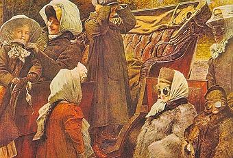 Un grupo de mujeres y niños vestidos para viajar en un automóvil a principios del siglo XX. La ilustración fue tomada de la Enciclopedia Salvatdel Automóvil.