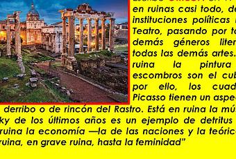 “Tiene otro aspecto, mirado por su reverso, la ruina: el que unas cosas acaben es condición para que otras nazcan. Si los edificios no cayesen en ruinas, si se conservasen imperecederos no quedaría sobre el haz del planeta, a estas horas, espacio para vivir nosotros, para construir nosotros. No podemos, pues, contentarnos con llorar sobre las ruinas; éstas hacen falta. El hombre, que es el gran constructor, es el gran destructor y su destino sería imposible si no fuese también un famoso fabricante de ruinas” (Ortega y Gasset(2)).