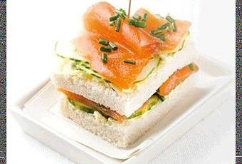 Formamos un milhojas con una rebanada de pan de molde untada con mantequilla, una loncha de Salmón Noruego Ahumado, tiras finas de pepino y cebollino, que repetimos en el mismo orden en una segunda capa.