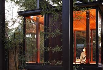 El volumen evoca la imagen de una linterna japonesa, flotando en el espacio, rodeada de un jardín plantado de bambú. Un pequeño basamento frente a la puerta de madera permite salvar el nivel de la sala. La puerta de madera, de 10 cm de espesor, es el único elemento vertical opaco de la habitación.