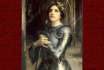 De campesina a guerreraJeanne d'Arc nació en un pueblecito de la región de Lorena, Domremý en 1412. A pesar de la guerra, Juana vivió una infancia feliz al lado de sus padres Jacques Darc e Isabelle Romée y sus cuatro hermanos. A la corta edad de 14 años la joven empezó a tener visiones y a oir voces extrañas, experiencias místicas que en un principio ocultó a sus padres. Juana identificó esas voces con dos santas, Santa Catalina de Alejandría y Santa Margarita de Antioquía, y con el Arcángel San Gabriel. De recibir mensajes confusos Juana pasó a oir con claridad una orden: debía partir con un ejército a Francia para levantar el sitio de Orleans, uno de los últimos reductos de la resistencia francesa frente a los ingleses.