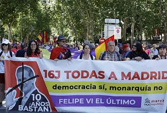 Una manifestación madrileña mostró el pasado domingo el tricolor republicano. Unas 4.000 personas, según la delegación del Gobierno (30.000 según la organización) se citaron en la Puerta del Sol, donde se leyó un manifiesto por parte del cineasta Benito Rabal, hijo del actor Paco Rabal, y por parte de la periodista Irene Zugasti. Una marcha que sirvió para que el movimiento republicano volviera a mostrar músculo por las calles de la capital. A los 10 años de reinado de Felipe VI, miles de republicanos pidieron una vez más el fin de la monarquía. Y los manifestantes reivindicaron el derecho de la ciudadanía a elegir democráticamente al jefe del Estado español. Convocada bajo el lema "10 años bastan", la protesta discurrió con gritos y con cánticos como "España mañana será republicana", "No hay 2 sin 3, república otra vez", "Los Borbones son unos ladrones" y algunos más actuales como "hay que cambiar el poder judicial". Los manifestantes desplegaron numerosas banderas republicanas y algunas en apoyo a Palestina. Entre los firmantes del texto que fue leído, figuraban periodistas como Olga Rodríguez y Cristina Fallarás; actores como Carlos Bardem, Alberto San Juan y Guillermo Toledo, formaciones musicales como Amparanoia, los Chikos del Maíz y Ska-P, el poeta Mario Obrero o el ex líder de Podemos, Pablo Iglesias, entre otras personalidades. Llegados desde la plaza de Colón, la Puerta de Alcalá y la glorieta de Neptuno, los manifestantes mostraron su repulsa a la monarquía días antes de que se cumpliese el décimo aniversario del reinado de Felipe VI, mientras el rey emérito surcaba a bordo del velero Bribón las aguas gallegas. Los activistas republicanos fueron convocados por más de un centenar de asociaciones que coparon el centro de la capital en la calurosa jornada de reivindicación con un claro mensaje: "La monarquía como principio choca con la democracia porque niega la capacidad del pueblo para dirigir el Estado". La protesta fue organizada por diversas entidades, como el Ateneo de Vallecas y Rivas Vaciamadrid y el Ateneo Popular de Carabanchel. A la movilización se sumaron algunos partidos políticos, como Izquierda Unida, el Partido Comunista de España, Barcelona en Comú, Verdes Equo y Podemos. En total, casi centenar y medio de organizaciones se sumaron al manifiesto.