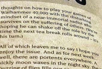 Ya en esta WDW,la numero 36 empiezan a darnos pistas de lo que viene la semana que viene.Sabemos a ciencia cierta,practicamente que lo que viene es de WFB y de El Fin de los Tiempos.Con el editorial de la WDW,el "Opening Salvo" que firma Jes Bickham nos lo ponen un poco mas claro.La imagen de arriba esta sacada de la pagina de BoLS y es una imagen de la revista fisica,pero en las versiones digitales sale exactamente igual:"And as for next week... well,there are portents everywhere. A sickly moon waxes in the night sky, the vile buzzing of flies fills our ears and we all feel a bit ill. What can it all mean?"