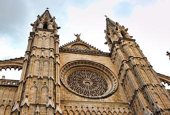 El exterior de la catedral de Palma es impresionante, siendo una de las razones por las que el monumento define la imagen de la isla. Su fachada principal, con un enorme rosetón y con altos contrafuertes, se eleva directamente junto al lugar donde se encontraban las antiguas murallas medievales. Por ello, la catedral parece dialogar con el mar, mostrando una silueta que destaca especialmente al amanecer y al atardecer. Esta combinación entre mar y estilo gótico es una de las postales más emblemáticas del Mediterráneo.