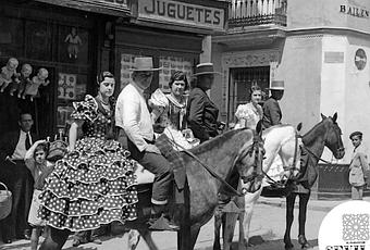 Esta fotografía es un claro ejemplo, en ella observamos tres parejas de caballistas camino del Real de la Feria. Lo primero que nos llama la atención es que el entorno no es el acostumbrado a la hora de ver este tipo de imágenes...