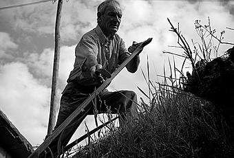 Por San Juan suele ser que comienza esta ardua tarea en las zonas de media montaña como en la que nos encontramos. Un sólo corte dan aquí los prados, quizás en alguna bárcena se pueda segar un segundo, de verde, en el resto será en la derrota de finales de septiembre y octubre donde se aproveche la otoñada. La hierba seca recogida será el sustento durante el largo invierno de todas las vacas de la cuadra. Se empieza picando el dalle, para ello elige el paisano una buena sombra y con paciencia y concentración pica y pica con acompasado ritmo, mojando de vez en cuando el martillo en la lata con agua y vinagre o echando un salivazo sobre el filo. Nos deja el picador absortos con su música hasta que finaliza su trabajo sin haber cuarteado el dalle, saca la pizarra de la colodra, un par de pasadas y a segar. Todo un arte el de segar a dalle, piernas abiertas y ligeramente flexionadas, pasos cortos, espalda arqueada, y buen giro de hombros y cintura. "Nadie se puede casar en esta zona sin saber picar y segar a dalle" (Braulio dice). Por eso vemos a Roberto practicar, aunque me parece que ya lo traía de casa. Una vez el prado desorillado y echada la senda de mojón a mojón para no invadir al vecino, entra la máquina de segar, (la Ajuria, la Hoz o la Trepa) traccionada por la pareja de vacas y conducida por el delantero; el chaval irá sentado atento a pisar el pedal y levantar el peine en caso de que haya una tapanoria, que no se estrague la cuchilla. De vez en cuando ésta cercena alguna rana o estropea un nido de codorniz, después vendrá la cigüeña o el ratonero haciendo limpieza, la cadena trófica no para. A mitad de prado se hace un descanso, se quitan los bozales a las vacas para que merienden y nosotros sacamos la bota y tomamos un bocado al socallo de la lindera, pues aun siendo verano el cierzo viene fresco. Con la ayuda del sol y un par de vueltas, la hierba estará seca y preparada para echarla al carro y llevarla al pajar. Se arma el carro con la puente, las armaduras y el escalerón, posiblemente el prado lo metamos de un par de viajes, los minifundios no dan para más. El paisano horconea la hierba, las mujeres arrastrillan y el chaval a poner y pisar el carro, que quede igualado y bonito. Se le ata con la soga, se le peina con el rastrillo para no perder ni una hierba en el trayecto y al pajar; cuidado de no entornar por el camino. En el pajar se coloca postada a postada bien pisado, durante el invierto se irá mesando con el cachavo y repartiendo a las vacas por las boqueras. Finaliza la recogida de la hierba alrededor de San Lorenzo celebrándolo comiendo el gallo o en su defecto el mejor pollo del corral. Si sería importante la labor que hasta el cura autorizaba públicamente al comienzo del verano el poder trabajar los domingos, con la excepción del día de Santiago Apóstol y el de la Virgen de agosto. Hoy los viejos aperos como el carro, las armaduras, la máquina de segar y hasta el mismo dalle, duermen el sueño de los justos en algún portalón, esperando que algún lugareño o veraneante escaso de leña los despiecen, o si tienen mejor suerte, algún caprichoso o anticuario los pondrá en el jardín del chalet o museo etnográfico. Recientemente he leido la siguiente frase atribuida a Virgilio: "¡Qué felices serían los campesinos si supieran que son felices!" ¿Éramos felices? creo que si, pero quizás no lo supiéramos, por eso intentamos buscar la felicidad en otro lugar. ¿Tendrá esto algo que ver con la despoblación rural?