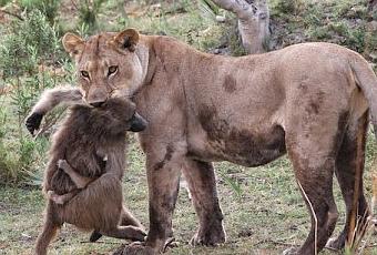 Una leona cazó a una hembra que llevaba una cría en su regazo. Cuando la madre perdió la vida, la cría se desenganchó de su madre.
