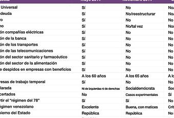 El bloguero y periodista español Juan Manuel del Alamo, ha publicado en su cuenta de twitter este cuadro sobre la evolución de las posiciones políticas del partido político Podemos en tan solo un año.