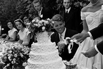 La tarta se hizo en Plourdes Bakery de Fall River. Parece ser que un par de años antes de la boda, JFK estando de campaña entró en la pastelería de Fall River para comprar unos cupcakes. Le gustó tanto todo lo que vio expuesto que dijo "cuando me case vendré a buscar el pastel aquí". Mentira, que no fue a buscarlo que se lo trajeron a la boda, y así la familia Plourdes, por haber hecho la tarta, fueron invitados al gran enlace.