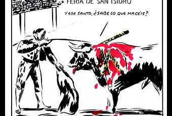 Vanesa Rodríguez publicaba el pasado miércoles en Eldiario.es un curioso reportaje bajo este título, con dibujos de El Roto. “Las mulillas –dice éste– arrastran al desolladero un cuerpo al terminar la faena. Es el fin del espectáculo, de la 'fiesta nacional'. El público aplaude enfervorecido en los tendidos. Agitan sus pañuelos blancos pidiendo al presidente los trofeos del animal. Una oreja. La otra. ¡El rabo! Pero, en esta ocasión, no vemos un toro ensangrentado, con la lengua fuera, rebozado por el albero al son de los cascabeles. El arrastrado es el torero. Porque esta no es la imagen de una tauromaquia al uso: esta es la de El Roto”. Andrés Rábago, más conocido como El Roto, ilustra las columnas antitaurinas escritas por su compañero, Manuel Vicent a lo largo de más de 20 años al calor de eventos como la Feria de San Isidro. Son textos críticos y directos que no se andan con ambages, empezando con un lema que grita en la primera página: “Si el toreo es cultura, el canibalismo es gastronomía”. Son 36 ilustraciones que salpican las páginas de AntiTauromaquia (Random House) “como 36 banderillas, dirigidas a clavarse en la conciencia de aquellos que todavía defienden ese espectáculo”.